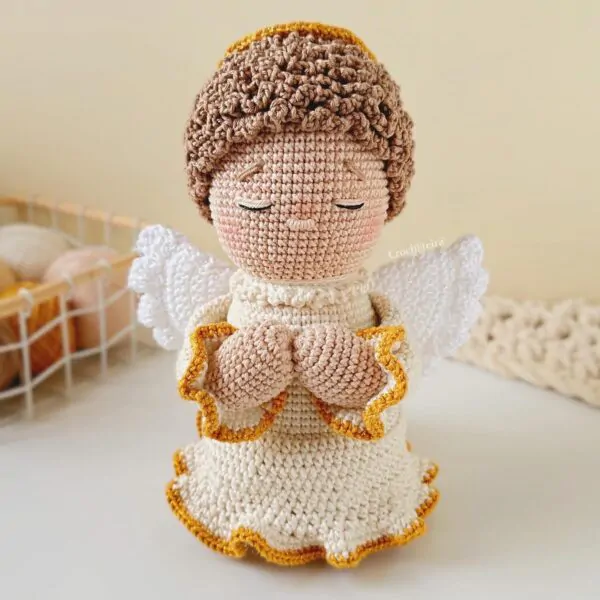 Este e-book é um arquivo digital e contém o passo-a-passo com fotos e vídeos auxiliares para a confecção de um anjo em posição de oração, em amigurumi.